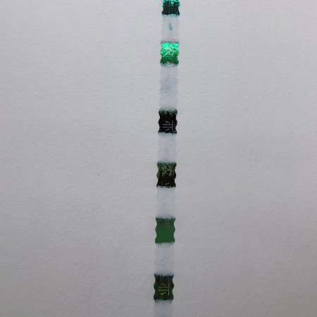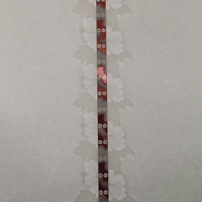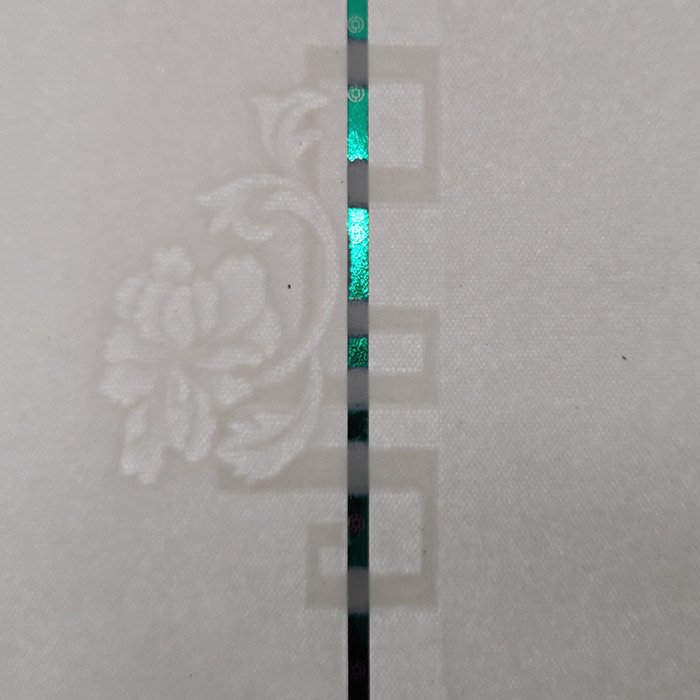 在造纸的过程中(zhōng),在水印纸张的特定位置包埋入特制的金属線(xiàn)或不同颜色的聚酯类塑料線(xiàn)、缩微印刷線(xiàn)或荧光線(xiàn)。对光观察时可(kě)见到有(yǒu)一条完整的或断续(开窗)的線(xiàn)埋 藏于纸基中(zhōng)。線(xiàn)的形状一般為(wèi)直線(xiàn),也可(kě)作(zuò)成波浪型、锯齿型等。开窗式安(ān)全線(xiàn)断续的暴露于纸面,用(yòng)复印机复印时,暴露的金属線(xiàn)被复印成断续的黑線(xiàn),故不能(néng)复 制。安(ān)全線(xiàn)可(kě)设计成各种颜色,也可(kě)双色间隔的同处一条線(xiàn)上,線(xiàn)上还可(kě)有(yǒu)缩微文(wén)字。