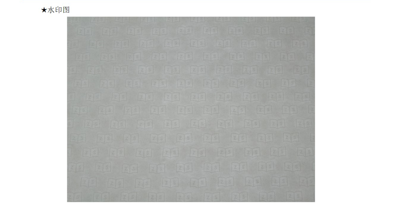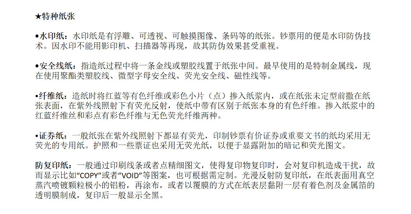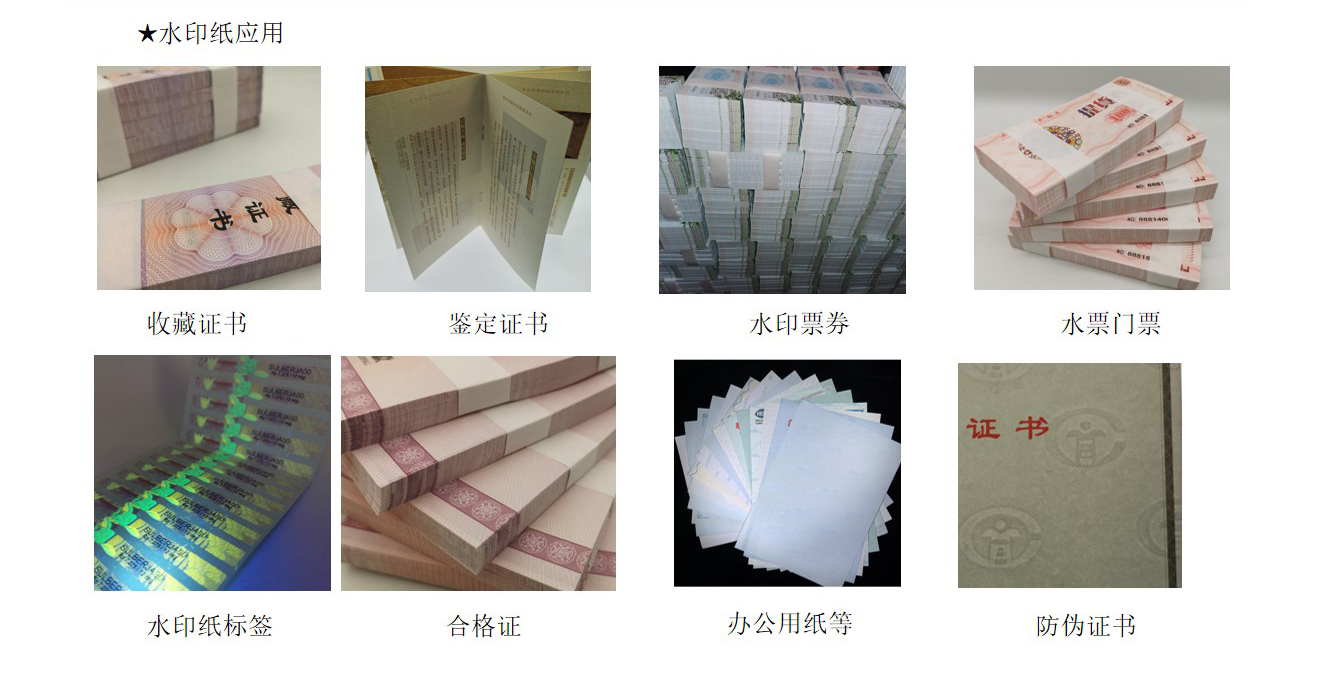 水印纸:水印纸是有(yǒu)浮雕、可(kě)触摸图像、条码等的纸张。钞票用(yòng)的便是水印防伪技(jì )术。因水印不能(néng)用(yòng)影印机、扫描器等再现,故其防伪效果甚受重视。