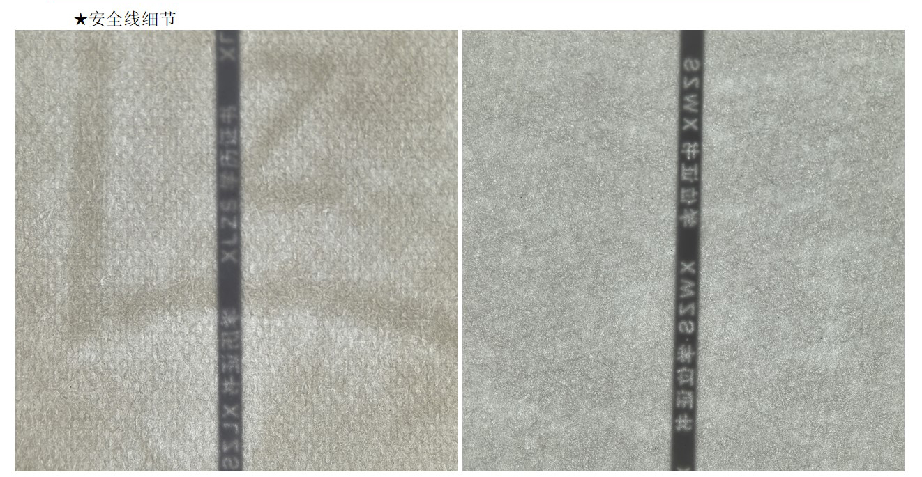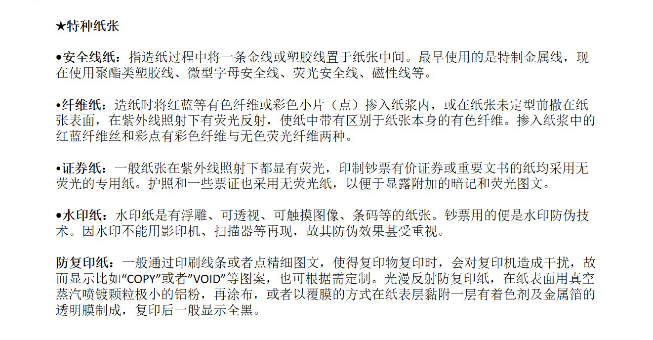 安(ān)全線(xiàn)纸:指造纸过程中(zhōng)将一条金線(xiàn)或塑胶線(xiàn)置于纸张中(zhōng)间。起初使用(yòng)的是特制金属線(xiàn),现在使用(yòng)聚酯类塑胶線(xiàn)、微型字母安(ān)全線(xiàn)、荧光安(ān)全線(xiàn)、磁性線(xiàn)等。